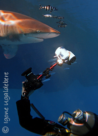 and out of sight behind the dive platform: an Oceanic Whitetip Shark.
