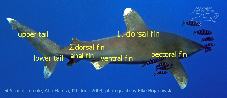 The white and/or dark colour patterns on all fins are the primary tools to identify individual oceanic whitetip sharks. Additionally one can use the pigmentation pattern on the belly and the tail stock, as well as the grey-to-white line from the eye to the pectoral fin.
